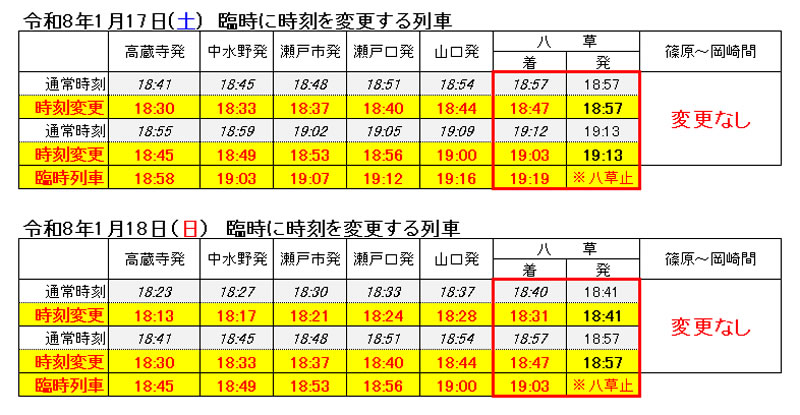 令和8年1月17日(土)・18日(日)は大学入学共通テストが実施されるため、一部列車の編成両数や北野桝塚駅(Kitanomasuzuka)でのお乗換えの有無等を変更して運転いたします。なお、両日とも一部の時間帯において高蔵寺駅(Kozoji)から八草駅(Yakusa)までの運転時刻を変更し、大学入学共通テスト臨時ダイヤで運転いたします。詳細は下記の時刻表をご覧ください。